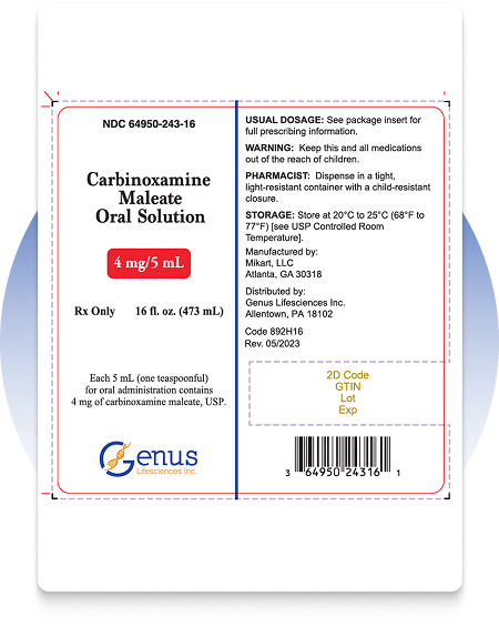 Carbinoxamine Maleate Oral Solution (OS) is a prescribed antihistamine indicated to treat symptoms of seasonal (short-term) or perennial (long-term) allergies, such as sneezing, runny nose, itching, watery eyes, hives, skin rash, itching, or wheezing. It is also used to treat symptoms of allergic rhinitis, allergic conjunctivitis caused by inhaled allergens and foods, or allergic skin reactions.